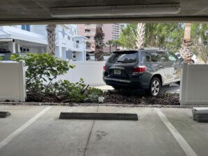 car drives through parking garage