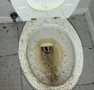 Here is a photo of a toilet where that was the case. The brown streaks you see here are from the feet of rats, scratching their way in and out. Yes it is gross.